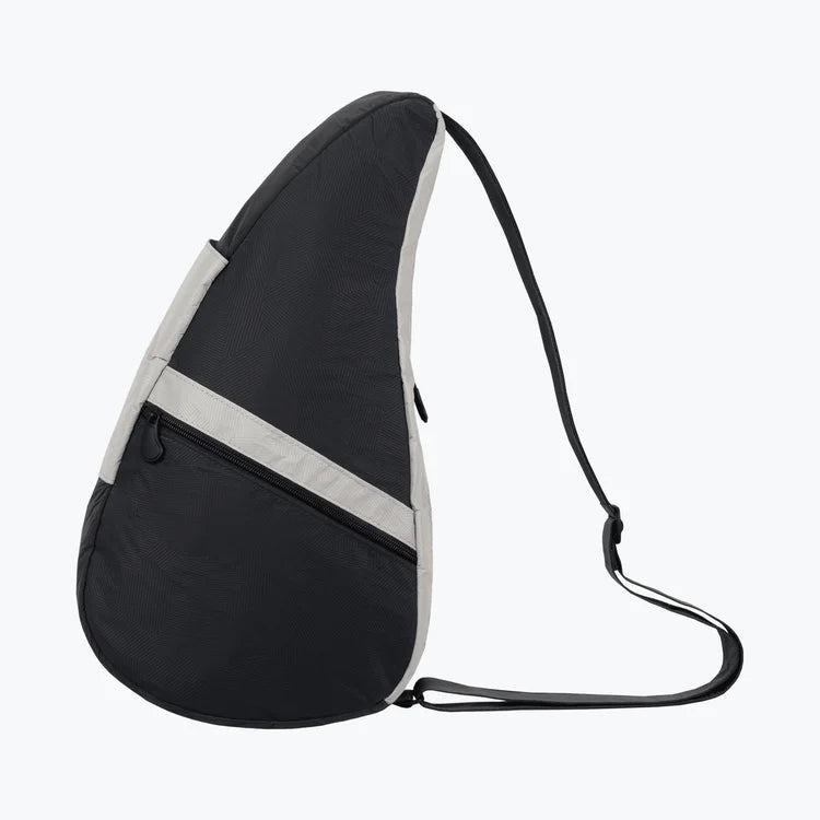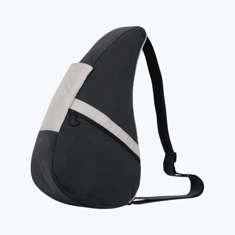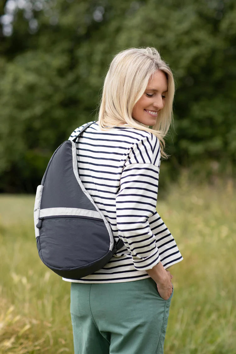 Een tweekleurige tas van donker- en lichtgrijs Tyvek® met een subtiel lijnpatroon. Dankzij de kleurvlakken aan beide zijden biedt de tas twee verschillende looks in één.